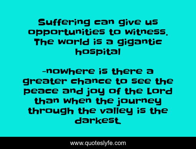 This page presents the quote "Suffering can give us opportunities to witness. The world is a gigantic hospital". Author of this quote is nowhere is there a greater chance to see the peace and joy of the Lord than when the journey through the valley is the darkest.. This quote is about billy graham in quotes, billy graham,.