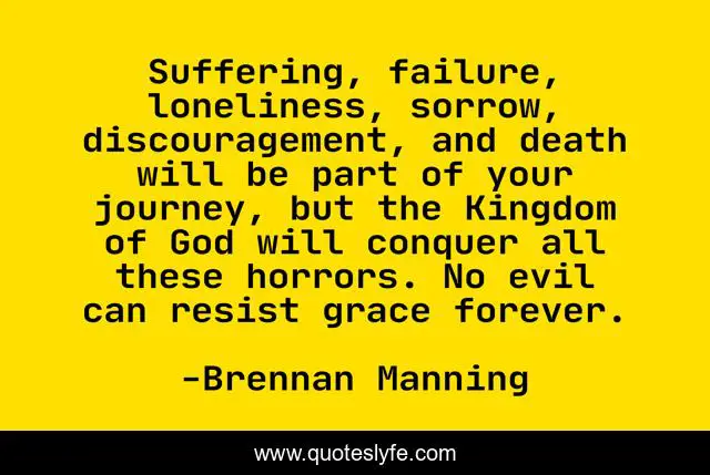 This page presents the quote "Suffering, failure, loneliness, sorrow, discouragement, and death will be part of your journey, but the Kingdom of God will conquer all these horrors. No evil can resist grace forever.". Author of this quote is Brennan Manning. This quote is about death, evil, journey,.