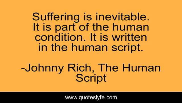 This page presents the quote "Suffering is inevitable. It is part of the human condition. It is written in the human script.". Author of this quote is Johnny Rich, The Human Script. This quote is about human-script, destiny, fate, suffering, inevitability, human-condition, inevitable,.