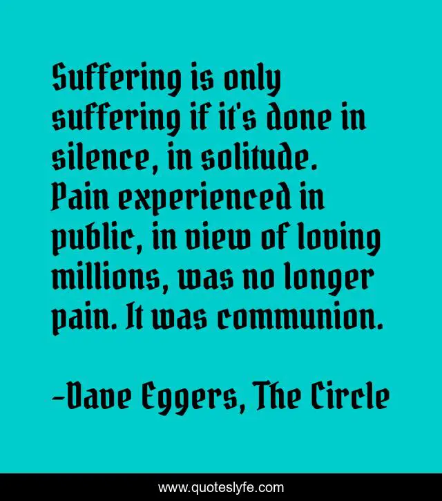 This page presents the quote "Suffering is only suffering if it's done in silence, in solitude. Pain experienced in public, in view of loving millions, was no longer pain. It was communion.". Author of this quote is Dave Eggers, The Circle. This quote is about communion, suffering, pain, silence,.