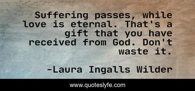 This page presents the quote "Suffering passes, while love is eternal. That's a gift that you have received from God. Don't waste it.". Author of this quote is Laura Ingalls Wilder. This quote is about god, gift, love is,.