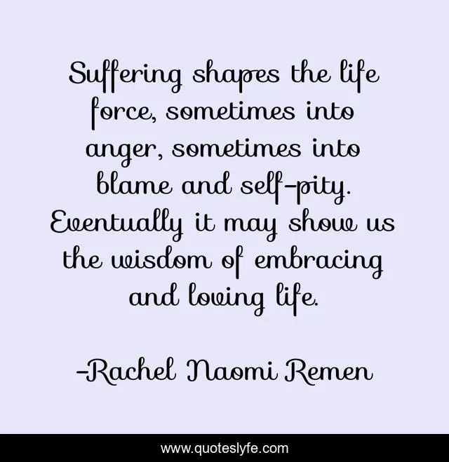 This page presents the quote "Suffering shapes the life force, sometimes into anger, sometimes into blame and self-pity. Eventually it may show us the wisdom of embracing and loving life.". Author of this quote is Rachel Naomi Remen. This quote is about anger, life, love, suffering, affection,.