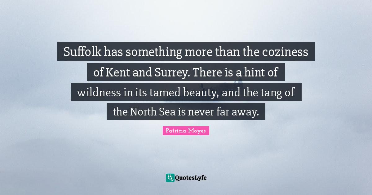 This page presents the quote "Suffolk has something more than the coziness of Kent and Surrey. There is a hint of wildness in its tamed beauty, and the tang of the North Sea is never far away.". Author of this quote is Patricia Moyes. This quote is about hints, sea, tamed, far away, wildness, kent, beauty,.