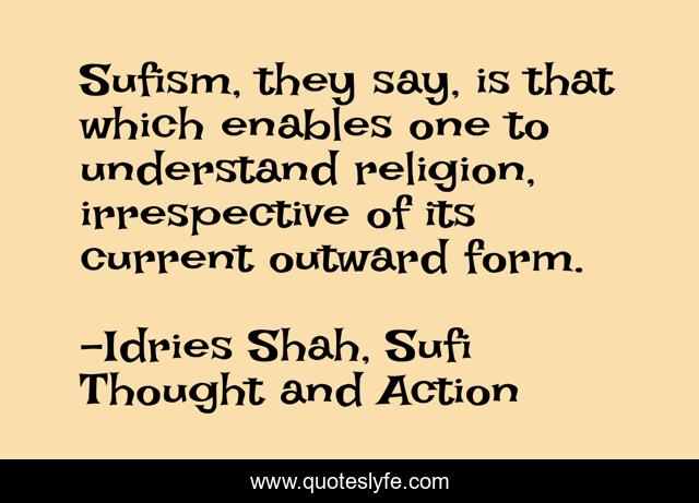 This page presents the quote "Sufism, they say, is that which enables one to understand religion, irrespective of its current outward form.". Author of this quote is Idries Shah, Sufi Thought and Action. This quote is about religion, sufis, psychology, sufism,.