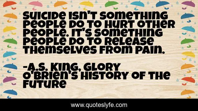 This page presents the quote "Suicide isn't something people do to hurt other people. It's something people do to release themselves from pain.". Author of this quote is A.S. King, Glory O'Brien's History of the Future. .
