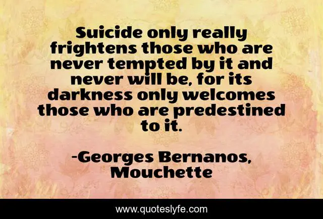 This page presents the quote "Suicide only really frightens those who are never tempted by it and never will be, for its darkness only welcomes those who are predestined to it.". Author of this quote is Georges Bernanos, Mouchette. .