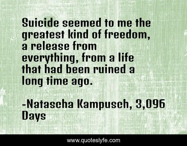This page presents the quote "Suicide seemed to me the greatest kind of freedom, a release from everything, from a life that had been ruined a long time ago.". Author of this quote is Natascha Kampusch, 3,096 Days. This quote is about release, freedom, suicide,.