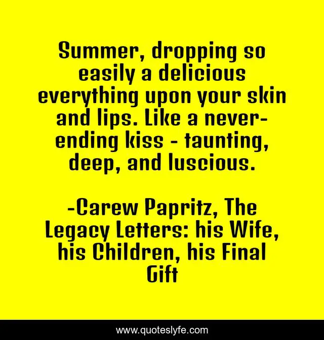 This page presents the quote "Summer, dropping so easily a delicious everything upon your skin and lips. Like a never-ending kiss - taunting, deep, and luscious.". Author of this quote is Carew Papritz, The Legacy Letters: his Wife, his Children, his Final Gift. This quote is about summer, carew-s, legacy, quotes-by-carew-papritz, the-legacy-letters, carew-papritz, book,.