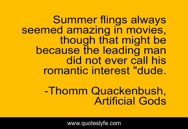 This page presents the quote "Summer flings always seemed amazing in movies, though that might be because the leading man did not ever call his romantic interest "dude.". Author of this quote is Thomm Quackenbush, Artificial Gods. This quote is about romance, movies, flings, summer,.