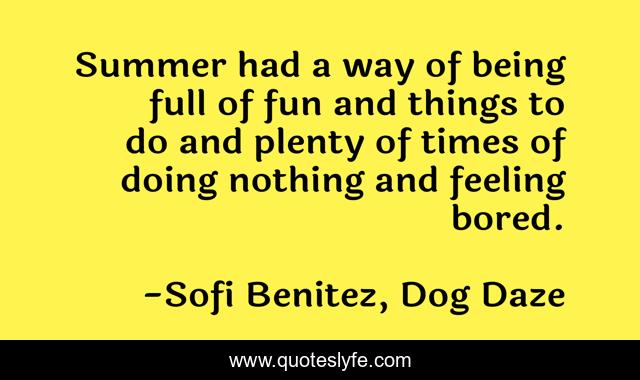 This page presents the quote "Summer had a way of being full of fun and things to do and plenty of times of doing nothing and feeling bored.". Author of this quote is Sofi Benitez, Dog Daze. This quote is about summer, honey-moon, dog-daze, things-to-do, brave-honeys, boredom, summertime, fun, bored,.
