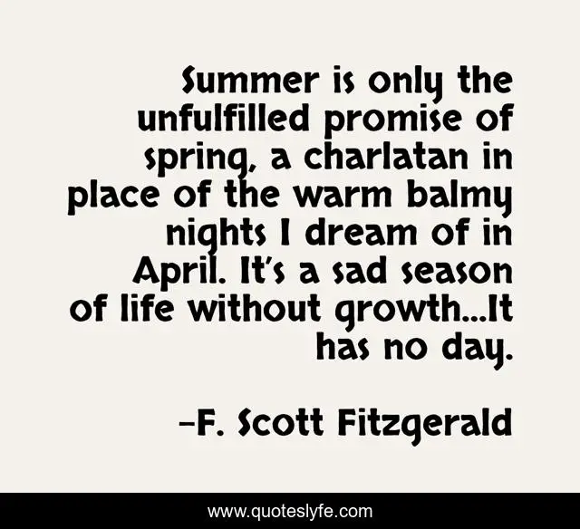 This page presents the quote "Summer is only the unfulfilled promise of spring, a charlatan in place of the warm balmy nights I dream of in April. It’s a sad season of life without growth…It has no day.". Author of this quote is F. Scott Fitzgerald. This quote is about summer, spring, april, growth, promise, seasons,.