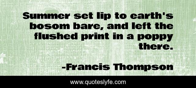 This page presents the quote "Summer set lip to earth's bosom bare, and left the flushed print in a poppy there.". Author of this quote is Francis Thompson. This quote is about love, flowers, nature-writing, affection, summer,.