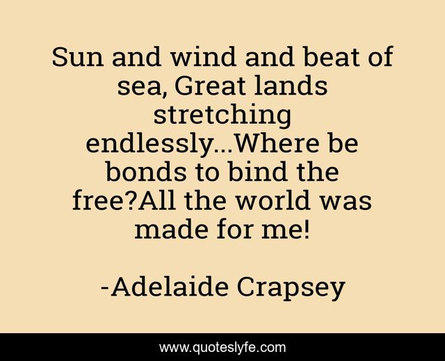 This page presents the quote "Sun and wind and beat of sea, Great lands stretching endlessly...Where be bonds to bind the free?All the world was made for me!". Author of this quote is Adelaide Crapsey. This quote is about travel, independence,.