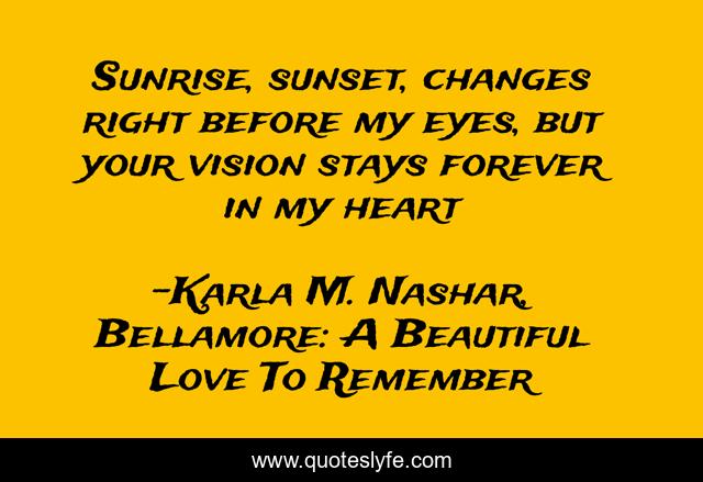 This page presents the quote "Sunrise, sunset, changes right before my eyes, but your vision stays forever in my heart". Author of this quote is Karla M. Nashar, Bellamore: A Beautiful Love To Remember. .