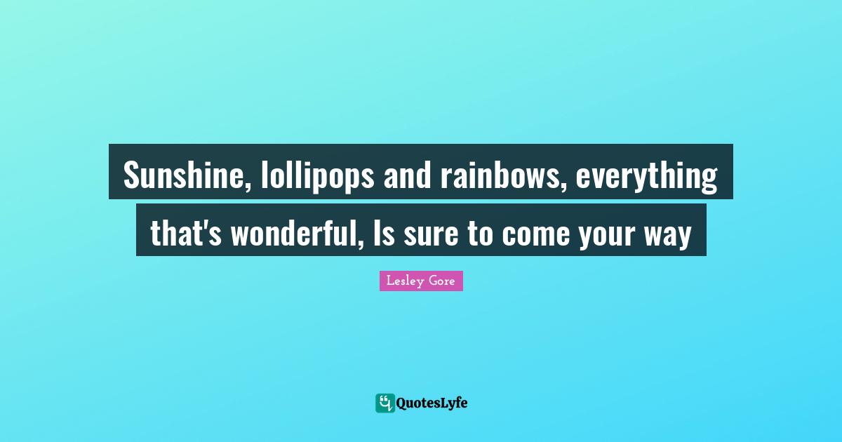 This page presents the quote "Sunshine, lollipops and rainbows, everything that's wonderful, Is sure to come your way". Author of this quote is Lesley Gore. This quote is about rainbow, wonderful, way, sunshine, lollipop,.