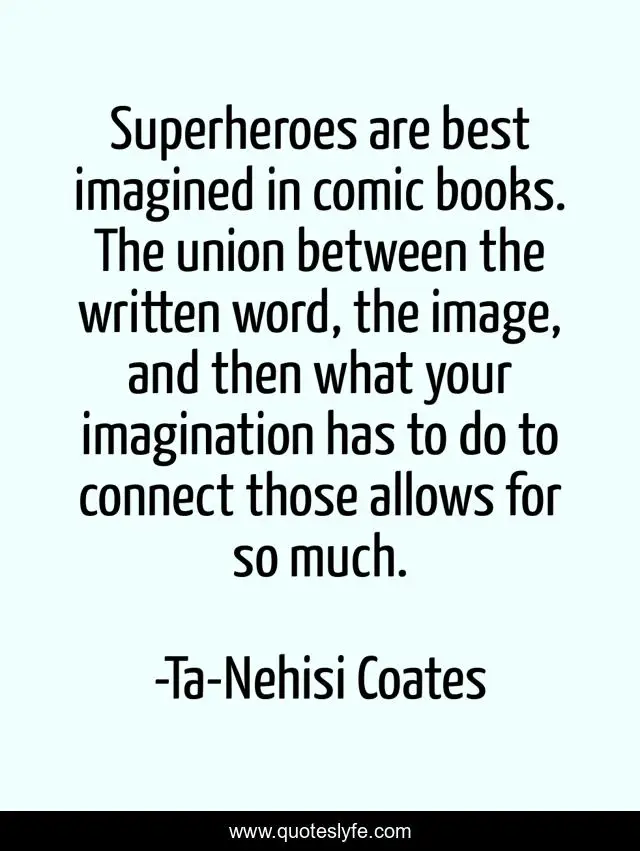This page presents the quote "Superheroes are best imagined in comic books. The union between the written word, the image, and then what your imagination has to do to connect those allows for so much.". Author of this quote is Ta-Nehisi Coates. This quote is about connect, best, between,.