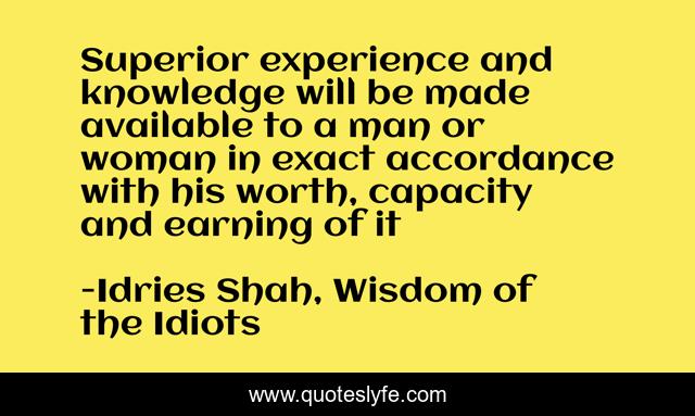 This page presents the quote "Superior experience and knowledge will be made available to a man or woman in exact accordance with his worth, capacity and earning of it". Author of this quote is Idries Shah, Wisdom of the Idiots. This quote is about sufism, evolution, sufis, wisdom,.