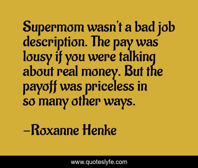 This page presents the quote "Supermom wasn't a bad job description. The pay was lousy if you were talking about real money. But the payoff was priceless in so many other ways.". Author of this quote is Roxanne Henke. .