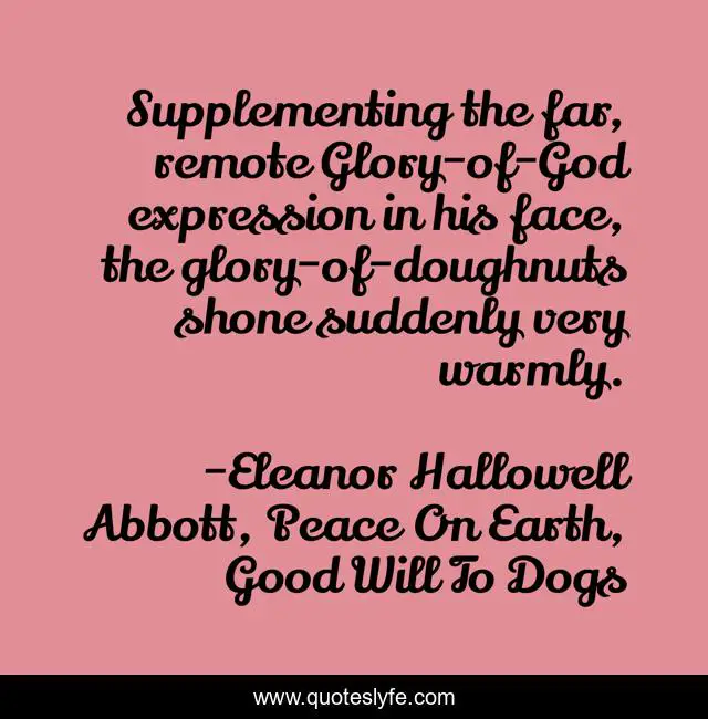 This page presents the quote "Supplementing the far, remote Glory-of-God expression in his face, the glory-of-doughnuts shone suddenly very warmly.". Author of this quote is Eleanor Hallowell Abbott, Peace On Earth, Good Will To Dogs. This quote is about funny, comedy, humor, doughnuts,.