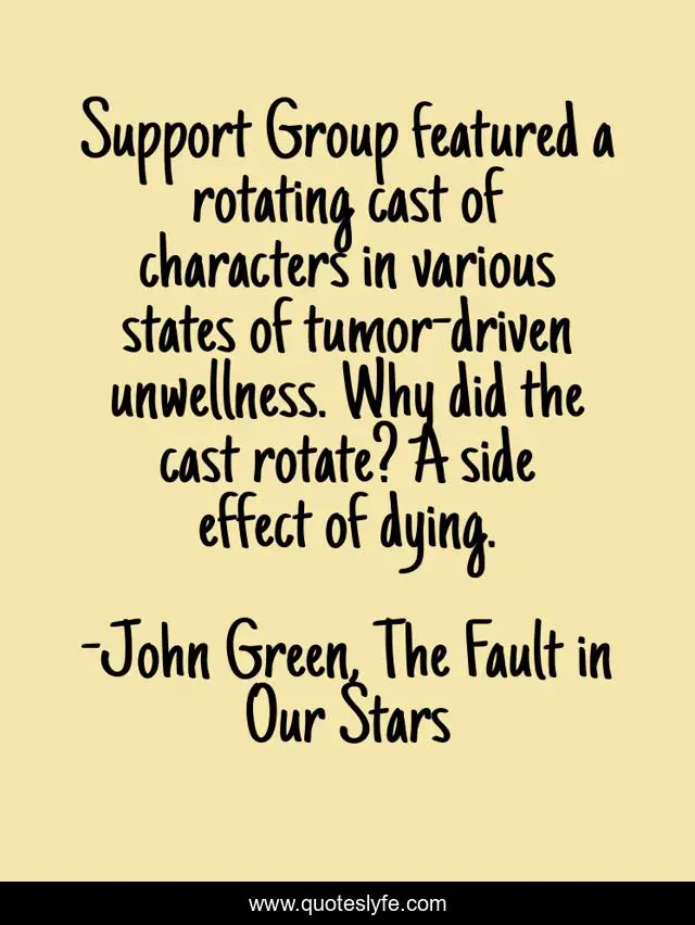 This page presents the quote "Support Group featured a rotating cast of characters in various states of tumor-driven unwellness. Why did the cast rotate? A side effect of dying.". Author of this quote is John Green, The Fault in Our Stars. This quote is about tfios, john-green, cancer, support-group,.