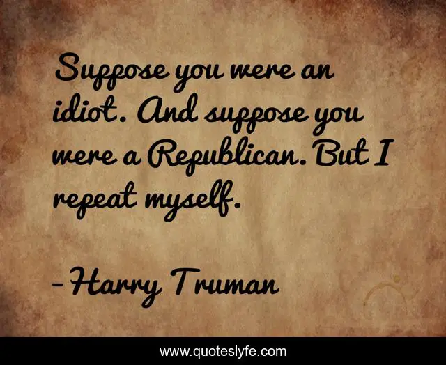 This page presents the quote "Suppose you were an idiot. And suppose you were a Republican. But I repeat myself.". Author of this quote is Harry Truman. This quote is about politics, republicans,.