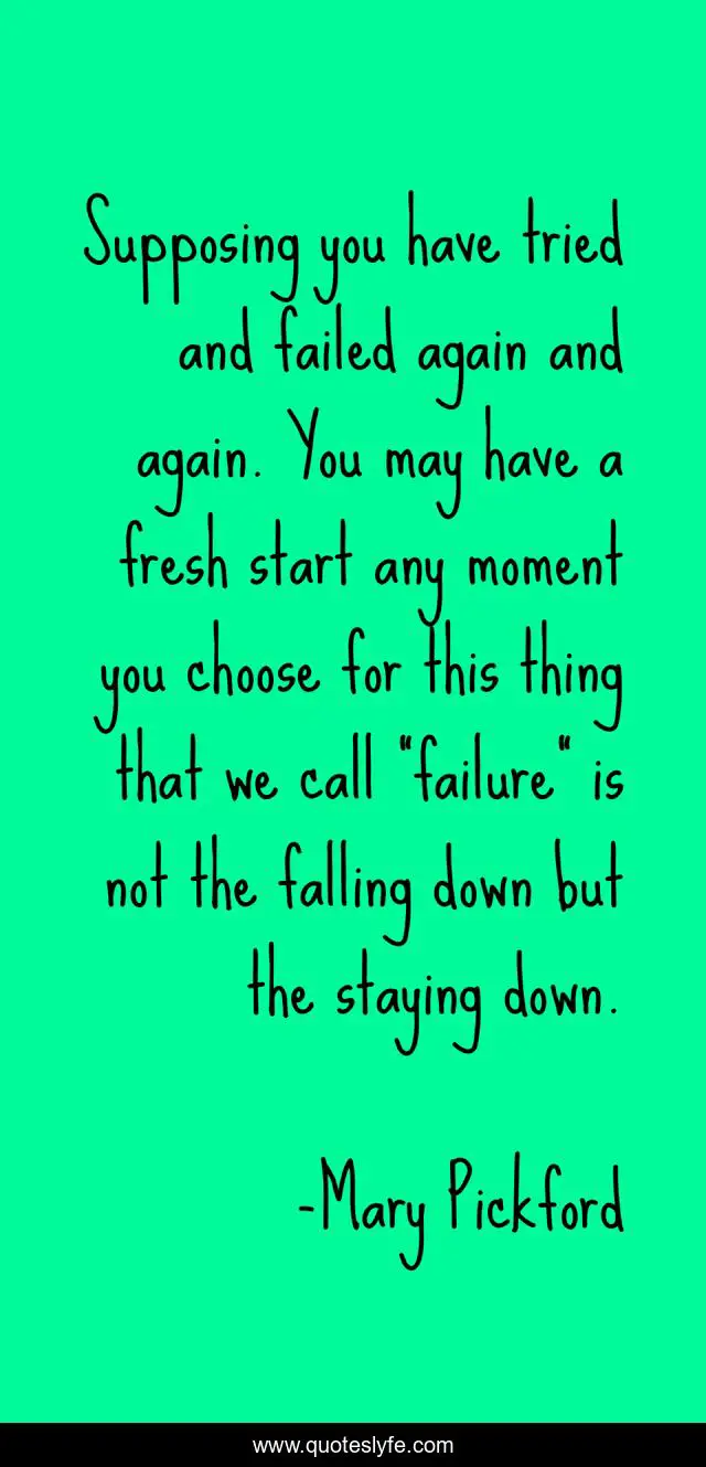 This page presents the quote "Supposing you have tried and failed again and again. You may have a fresh start any moment you choose for this thing that we call "failure" is not the falling down but the staying down.". Author of this quote is Mary Pickford. This quote is about failures, mistakes,.
