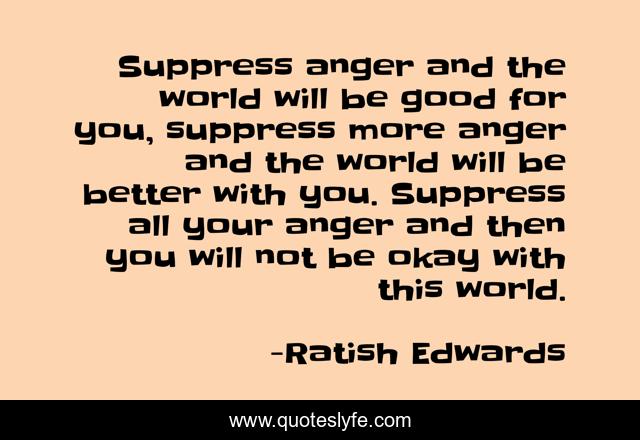 This page presents the quote "Suppress anger and the world will be good for you, suppress more anger and the world will be better with you. Suppress all your anger and then you will not be okay with this world.". Author of this quote is Ratish Edwards. This quote is about anger, life, love, from-the-book-of-edward, affection,.