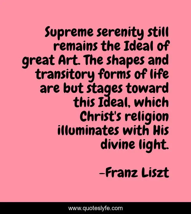 This page presents the quote "Supreme serenity still remains the Ideal of great Art. The shapes and transitory forms of life are but stages toward this Ideal, which Christ's religion illuminates with His divine light.". Author of this quote is Franz Liszt. This quote is about light, life, art,.