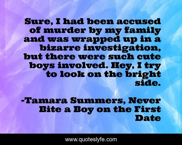 This page presents the quote "Sure, I had been accused of murder by my family and was wrapped up in a bizarre investigation, but there were such cute boys involved. Hey, I try to look on the bright side.". Author of this quote is Tamara Summers, Never Bite a Boy on the First Date. .