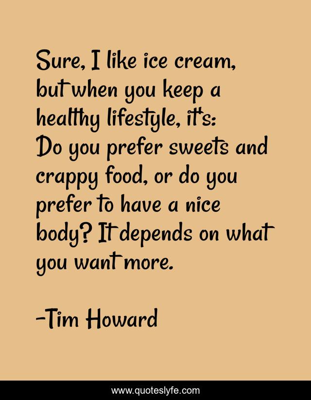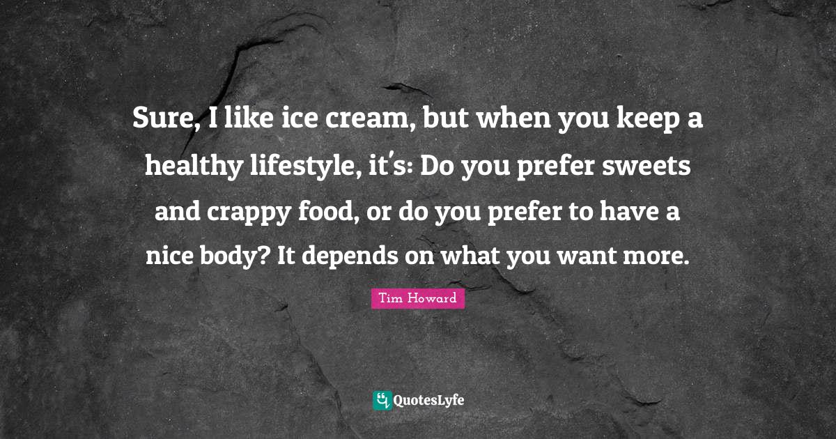 This page presents the quote "Sure, I like ice cream, but when you keep a healthy lifestyle, it's: Do you prefer sweets and crappy food, or do you prefer to have a nice body? It depends on what you want more.". Author of this quote is Tim Howard. This quote is about healthy, ice cream, nice,.