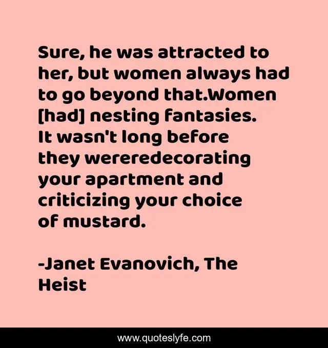 This page presents the quote "Sure, he was attracted to her, but women always had to go beyond that.Women [had] nesting fantasies. It wasn't long before they wereredecorating your apartment and criticizing your choice of mustard.". Author of this quote is Janet Evanovich, The Heist. This quote is about lee-goldberg, mustard, janet-evanovich, nick-fox, kate-o-hare, attraction, fantasies, women,.