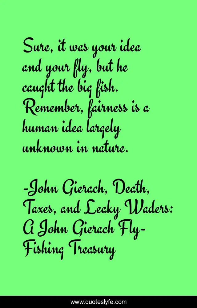This page presents the quote "Sure, it was your idea and your fly, but he caught the big fish. Remember, fairness is a human idea largely unknown in nature.". Author of this quote is John Gierach, Death, Taxes, and Leaky Waders: A John Gierach Fly-Fishing Treasury. This quote is about life, wisdom,.