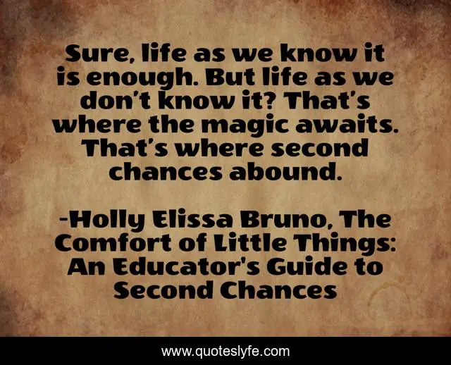 This page presents the quote "Sure, life as we know it is enough. But life as we don’t know it? That’s where the magic awaits. That’s where second chances abound.". Author of this quote is Holly Elissa Bruno, The Comfort of Little Things: An Educator's Guide to Second Chances. This quote is about enthusiasm, fear, courage, inspirational, 2nd-chances,.