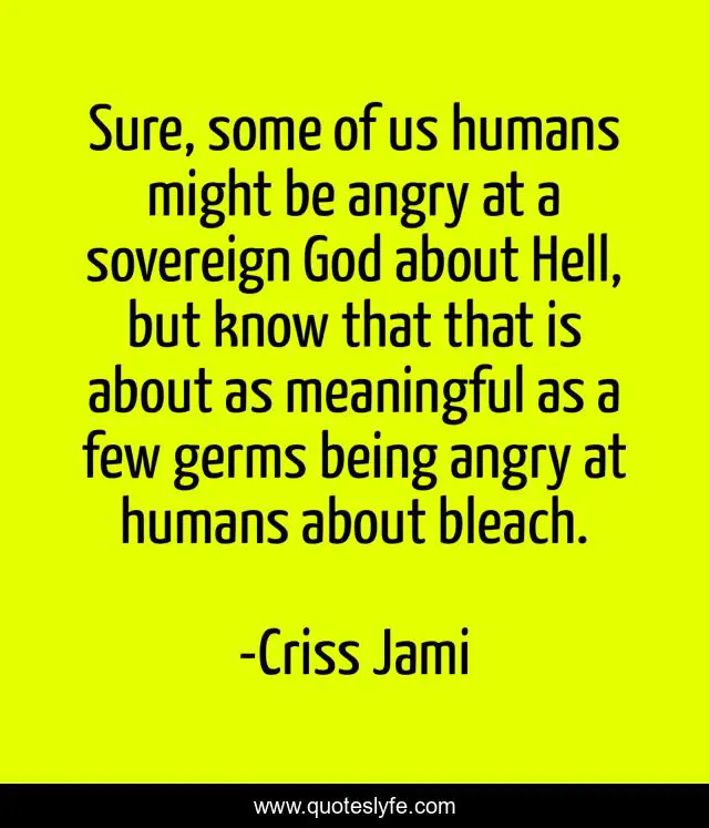 This page presents the quote "Sure, some of us humans might be angry at a sovereign God about Hell, but know that that is about as meaningful as a few germs being angry at humans about bleach.". Author of this quote is Criss Jami. This quote is about sovereignty-of-god, holiness, antitheism, god, bleach, hypocrisy, bacteria, holiness-of-god, sin,.