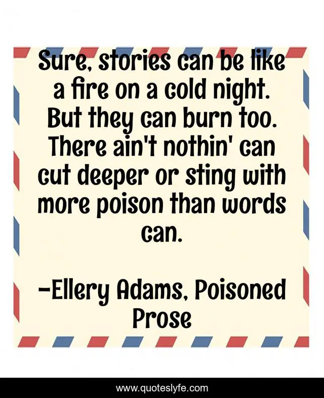 This page presents the quote "Sure, stories can be like a fire on a cold night. But they can burn too. There ain't nothin' can cut deeper or sting with more poison than words can.". Author of this quote is Ellery Adams, Poisoned Prose. This quote is about stories-have-power, words-have-power, words-of-wisdom,.