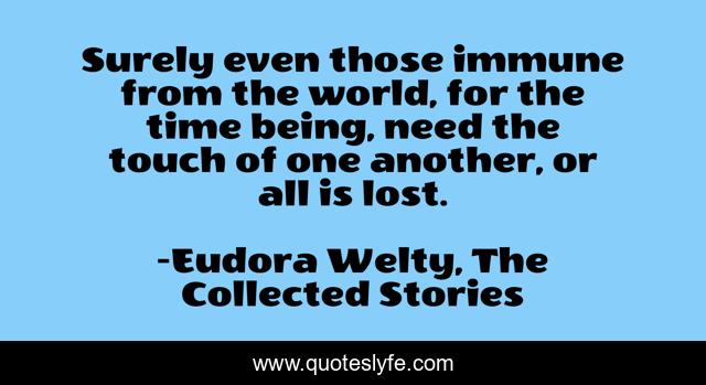 This page presents the quote "Surely even those immune from the world, for the time being, need the touch of one another, or all is lost.". Author of this quote is Eudora Welty, The Collected Stories. This quote is about psychosomatic, fruits-and-vegetables, time,.