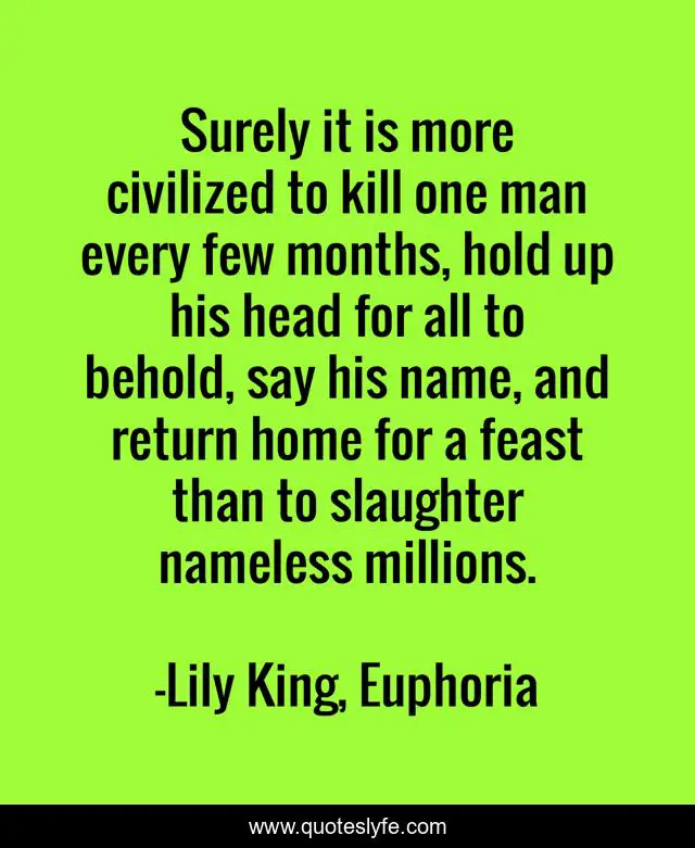 This page presents the quote "Surely it is more civilized to kill one man every few months, hold up his head for all to behold, say his name, and return home for a feast than to slaughter nameless millions.". Author of this quote is Lily King, Euphoria. .
