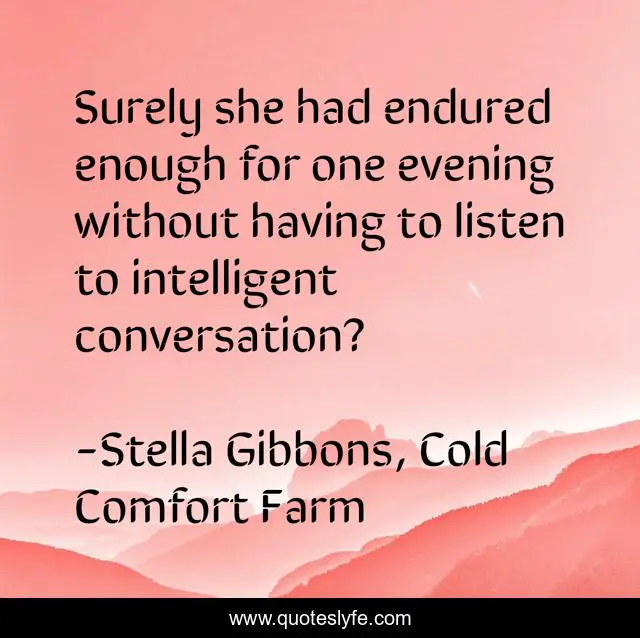 This page presents the quote "Surely she had endured enough for one evening without having to listen to intelligent conversation?". Author of this quote is Stella Gibbons, Cold Comfort Farm. This quote is about conversation, endurance,.