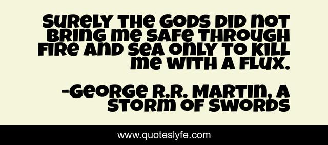 This page presents the quote "Surely the Gods did not bring me safe through fire and sea only to kill me with a flux.". Author of this quote is George R.R. Martin, A Storm of Swords. This quote is about davos, fire, gods, flux, kill, sea,.