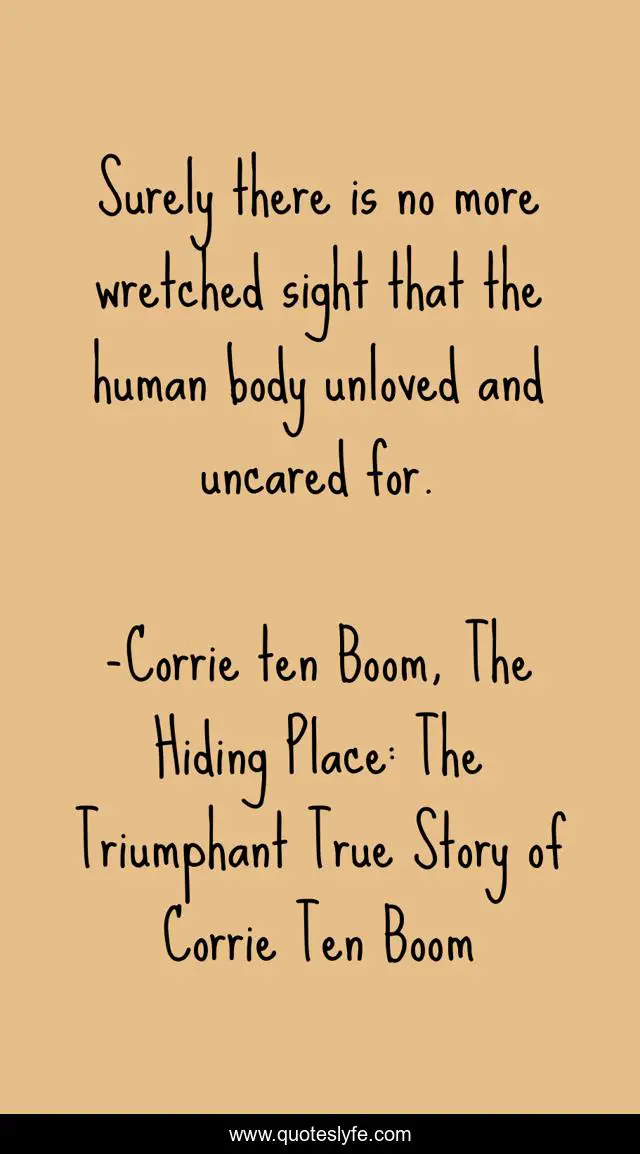 This page presents the quote "Surely there is no more wretched sight that the human body unloved and uncared for.". Author of this quote is Corrie ten Boom, The Hiding Place: The Triumphant True Story of Corrie Ten Boom. This quote is about jesus-christ, christian, corrie-ten-boom, holocaust, righteous-gentile, wwii, dutch,.