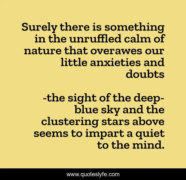 This page presents the quote "Surely there is something in the unruffled calm of nature that overawes our little anxieties and doubts". Author of this quote is the sight of the deep-blue sky and the clustering stars above seems to impart a quiet to the mind.. .