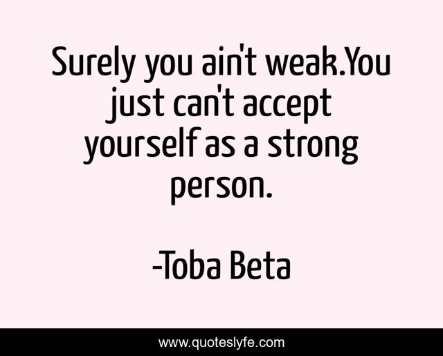 This page presents the quote "Surely you ain't weak.You just can't accept yourself as a strong person.". Author of this quote is Toba Beta. This quote is about perception, weak, strong,.