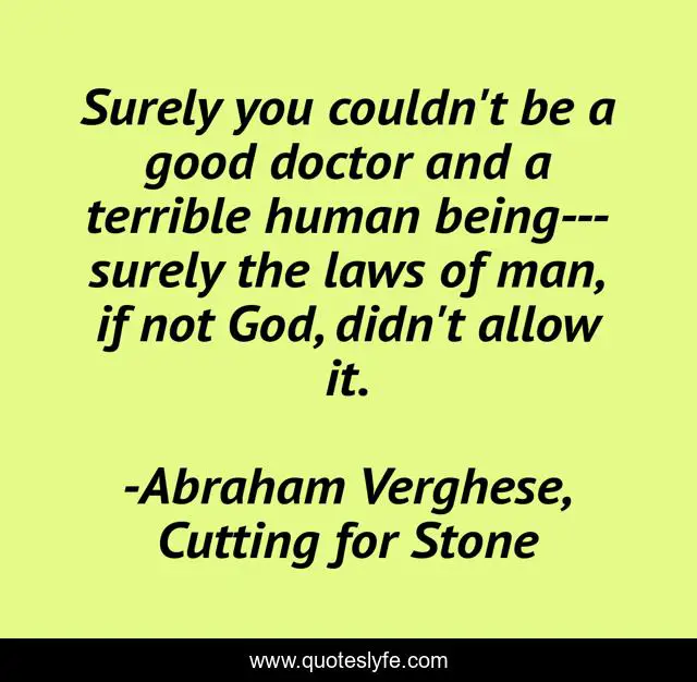 This page presents the quote "Surely you couldn't be a good doctor and a terrible human being---surely the laws of man, if not God, didn't allow it.". Author of this quote is Abraham Verghese, Cutting for Stone. .