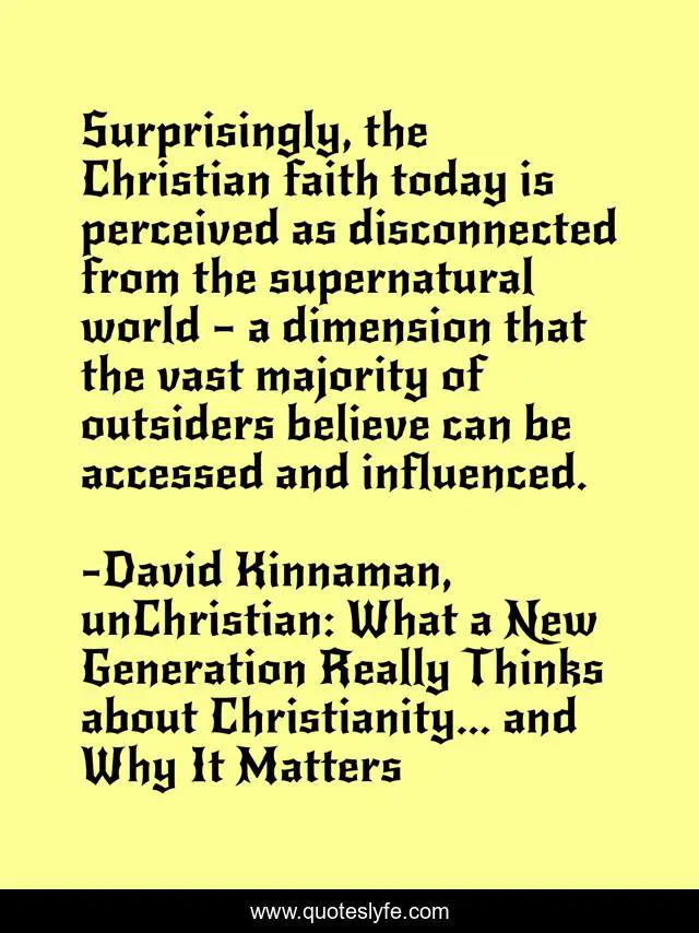 This page presents the quote "Surprisingly, the Christian faith today is perceived as disconnected from the supernatural world – a dimension that the vast majority of outsiders believe can be accessed and influenced.". Author of this quote is David Kinnaman, unChristian: What a New Generation Really Thinks about Christianity... and Why It Matters. This quote is about miracles, faith, holy-spirit,.