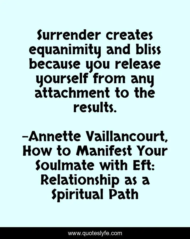 This page presents the quote "Surrender creates equanimity and bliss because you release yourself from any attachment to the results.". Author of this quote is Annette Vaillancourt, How to Manifest Your Soulmate with Eft: Relationship as a Spiritual Path. This quote is about surrender, bliss, equanimity,.