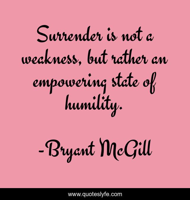 This page presents the quote "Surrender is not a weakness, but rather an empowering state of humility.". Author of this quote is Bryant McGill. This quote is about empowerment, humbleness, humility,.