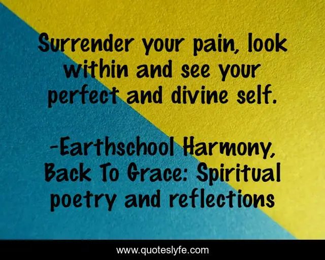 This page presents the quote "Surrender your pain, look within and see your perfect and divine self.". Author of this quote is Earthschool Harmony, Back To Grace: Spiritual poetry and reflections. This quote is about self-love, divine, love, spiritual, surrendering, healing, soulfood, surrender, affection,.