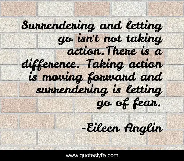 This page presents the quote "Surrendering and letting go isn't not taking action.There is a difference. Taking action is moving forward and surrendering is letting go of fear.". Author of this quote is Eileen Anglin. This quote is about letting-go, fearless, fear, surrender, take-action,.