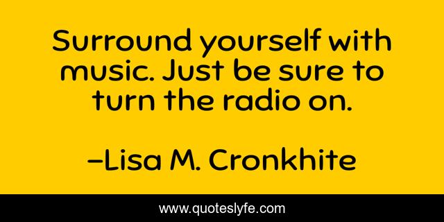 This page presents the quote "Surround yourself with music. Just be sure to turn the radio on.". Author of this quote is Lisa M. Cronkhite. This quote is about reading-books, reading, listening, thinking-of-you,.