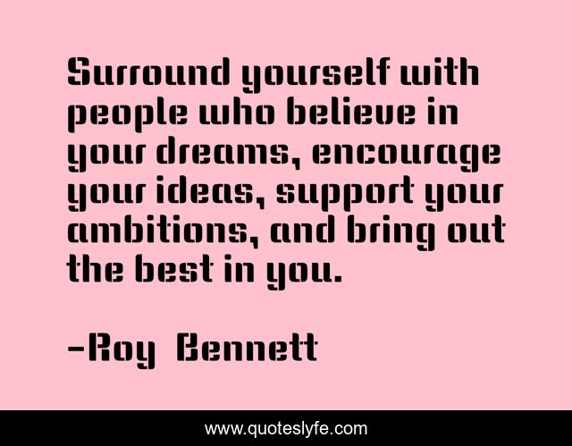 This page presents the quote "Surround yourself with people who believe in your dreams, encourage your ideas, support your ambitions, and bring out the best in you.". Author of this quote is Roy Bennett. This quote is about life, optimism, ambitions, being-positive, positive-affirmation, confidence, encouragement, ideas, optimistic,.